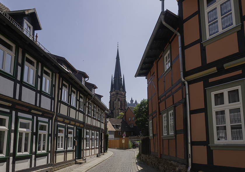 Foto vom Schloss auf die Altstadt Wernigerode, links der Turm der Sylvestrikirche und Westerntorturm,